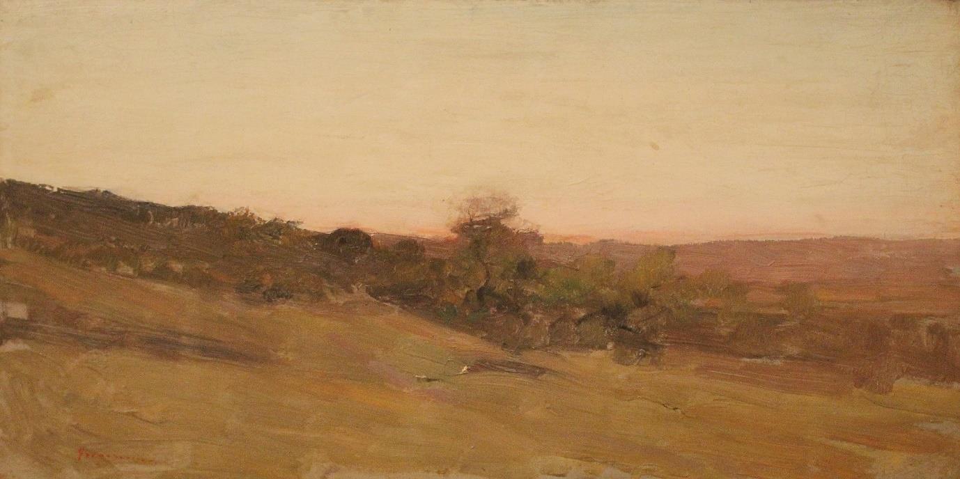 Grigorescu consemnează un spectacol al naturii care atinge coardele cele mai fine ale sensibilității sale. Transpune, în suverană libertate a mijloacelor de expresie, momentul unui sfârșit de apus de soare, când dispare ultima sclipire roșiatică de la orizont. Nicio altă prezență umană nu perturbă intimitatea comunicării dintre Artist și Natură în acest peisaj tăcut, cu lumină egală. Cerul și pământul își împart aproape egal suprafața picturii. Câteva accente marchează discret compoziția, prevenind monotonia unei posibile simetrii: coroana arborelui ce punctează centrul imaginii, deasupra liniei de orizont, și dreptunghiul de deal în diagonală, ce coboară din stânga. Tușele largi, sigure, de materie picturală, sunt așternute rapid de la stânga spre dreapta, într-o cromatică neutră de verde stins, ce corespunde momentului de înserare. Motivul revine în mai multe variante.