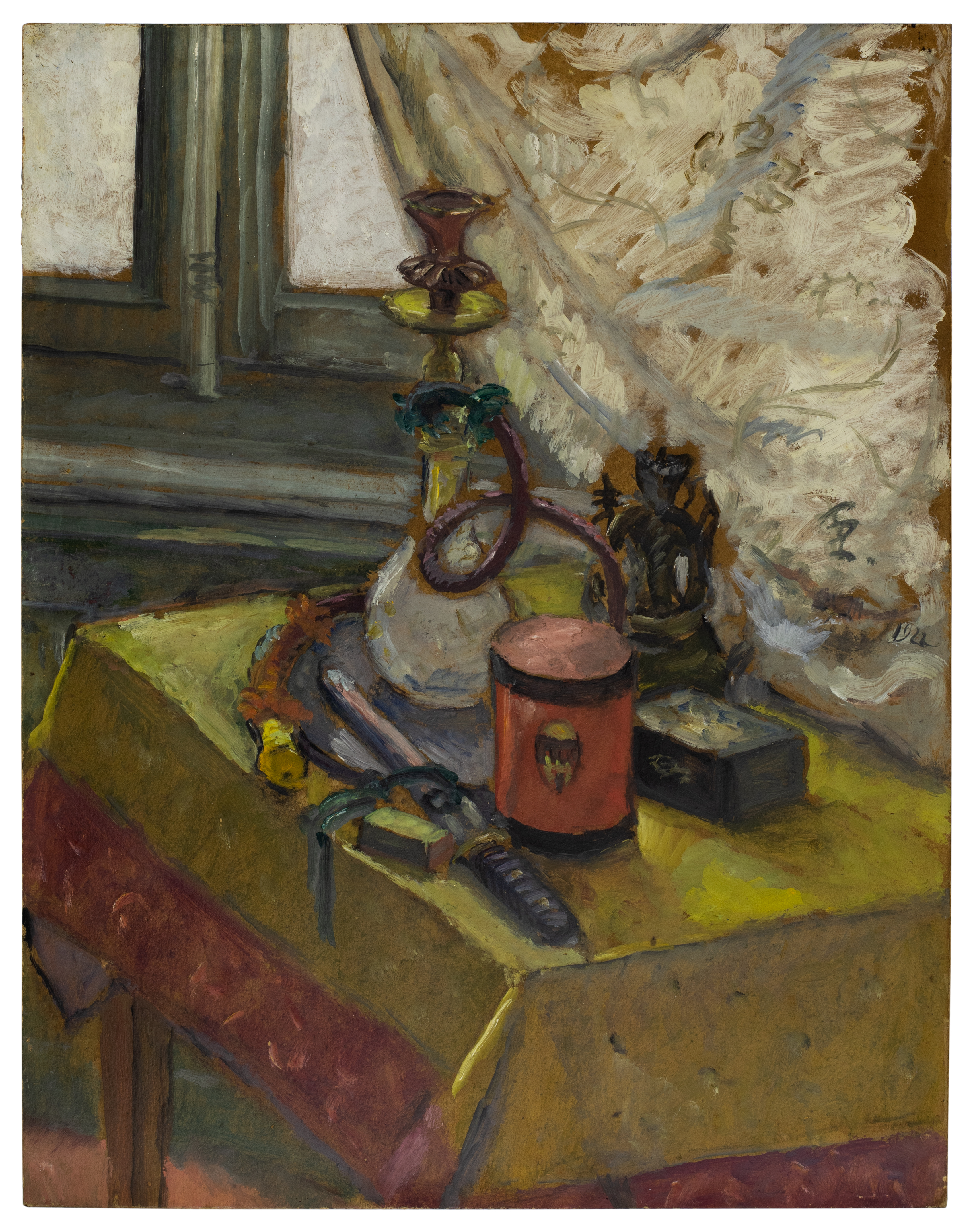 Theodor Pallady este „un pictor de interior” – ne arată constant criticii și istoricii de artă, așadar, el se simte cel mai bine în fața lucrurilor cunoscute din propriul microcosmos, a obiectelor privite și rearanjate în variațiuni infinite1. Spre deosebire de alte abordări ale artistului în același gen, această natură moartă lasă la vedere mai mult din interiorul domestic care o găzduiește – atelierul artistului –, integrând fereastra. În general, elementul separă și leagă totodată interiorul de exterior, în funcție de dispoziția creatorului, fereastra fiind reprezentată în două ipostaze: deschisă către Place Dauphine sau închisă hotărâtor, precum în acest caz2. Interiorizarea, separarea totală de lumesc este mai departe sporită și dublată prin dispunerea la dreapta a perdelei opace, decorată nervos cu linii energice, care lasă totodată la vedere suportul de carton. Tot la nivelul perdelei se află și semnătura în monogramă: „TP.”.
